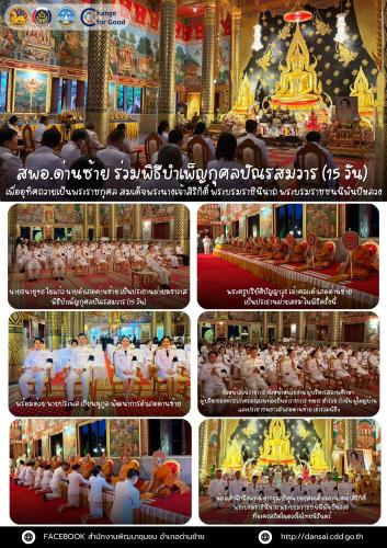 นายธนายุทธ ใยแก้ว นายอำเภอด่านซ้าย เป็นประธานฝ่ายฆราวาส พิธีบำเพ็ญกุศลปัณรสมวาร (15 วัน) เพื่ออุทิศถวายเป็นพระราชกุศล สมเด็จพระนางเจ้าสิริกิติ์ พระบรมราชินีนาถ พระบรมราชชนนีพันปีหลวง พร้อมด้วย นายประพล เขียนนุกูล พัฒนาการอำเภอด่านซ้าย หัวหน้าส่วนราชการ หัวหน้าหน่วยงาน ผู้บริหารสถานศึกษา ผู้บริหารองค์กรปกครองส่วนท้องถิ่นข้าราชการ ทหาร ตำรวจ กำนัน ผู้ใหญ่บ้าน และประชาชนชาวอำเภอด่านซ้าย เข้าร่วมพิธีฯ ในวันที่ 7 พฤศจิกายน 2568 เวลา 17.30 น. ณ อุโบสถวัดเนรมิตวิปัสสนา อำเภอด่านซ้าย จังหวัดเลย